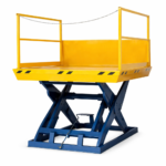 Mesas niveladoras tipo tijera para carga y descarga a nivel del suelo. Elevación hidráulica o mecánica y gran capacidad.